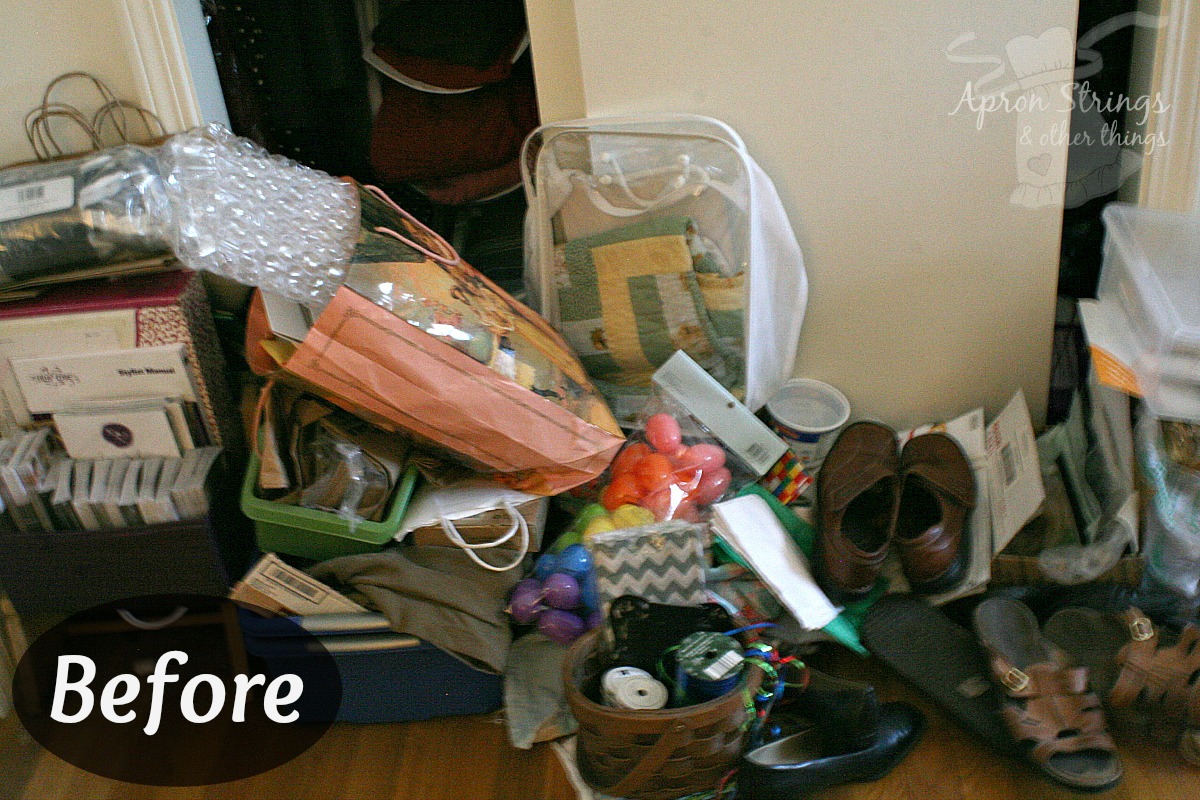 Do the easy stuff. See the shoes in the picture above? Duh. I knew where those belonged. Done. Plastic Easter eggs? There’s a box of holiday stuff to hold things like this. Done. Business Marketing Supplies? I have a drawer for those. Picking up the items that already had a home and taking each one there immediately made visible progress. Now I’m motivated! Notice I did not make piles for putting away later? That would mean I would have more work after I finished this work.